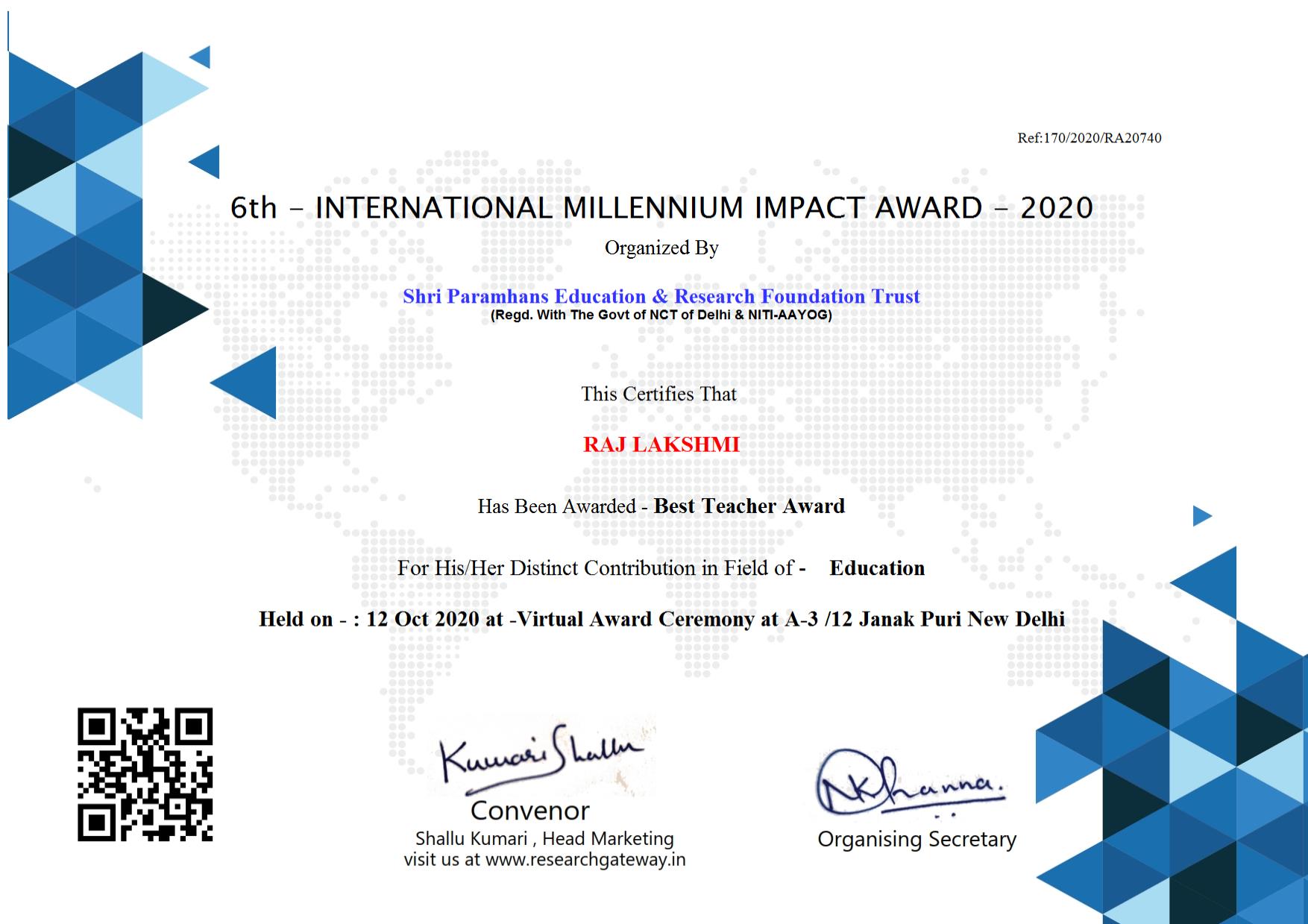 Nominated for: Women Teacher Award (Arts)